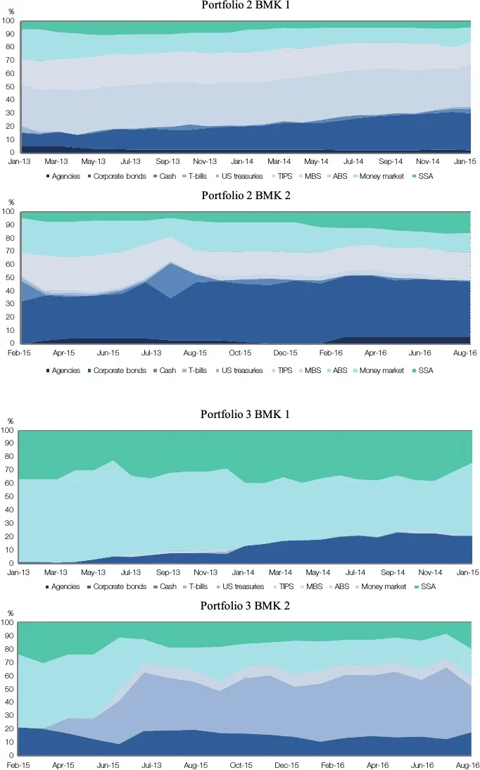 The whole observation period is from 31 December 2012 to 31 August 2016, but there is a change in the benchmark for the external managers and for the internally managed sub-portfolios starting from 31 January 2015. The benchmarks are set as shown in Table 4.1.
