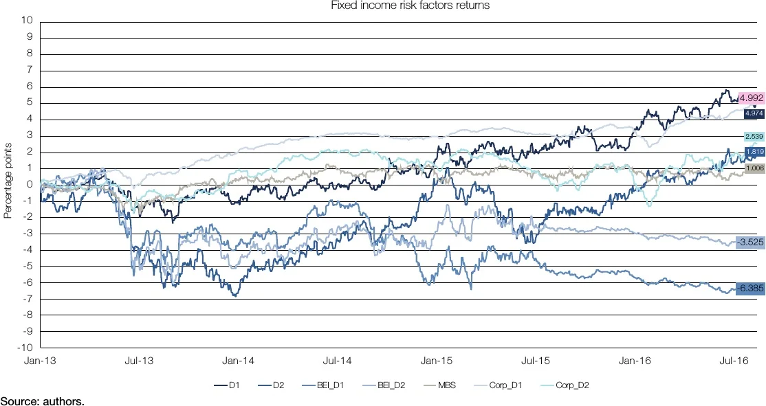 The returns of the individual risk factors also show different levels of importance for the different portfolios. For portfolio 4, there are seven risk factors that are relevant, with at least a 95% confidence level (5% significance), and five out of the seven factors are relevant with a 99.9% confidence level. This means the results for portfolio 4 over the whole period show evidence of style-driven strategies across several risk factors. For portfolio 3, on the other hand, only the slope (D2), break-even slope (BEI D2) and corporate spread slope (CORP D2) show evidence of being important in the generation of excess returns, and out of these three risk factors only break-even slope (BEI D2) has at least a 95% confidence level. This means the results for portfolio 3 over the whole period show little evidence of style-driven strategies, and most of its excess returns are generated by skill-driven strategies.