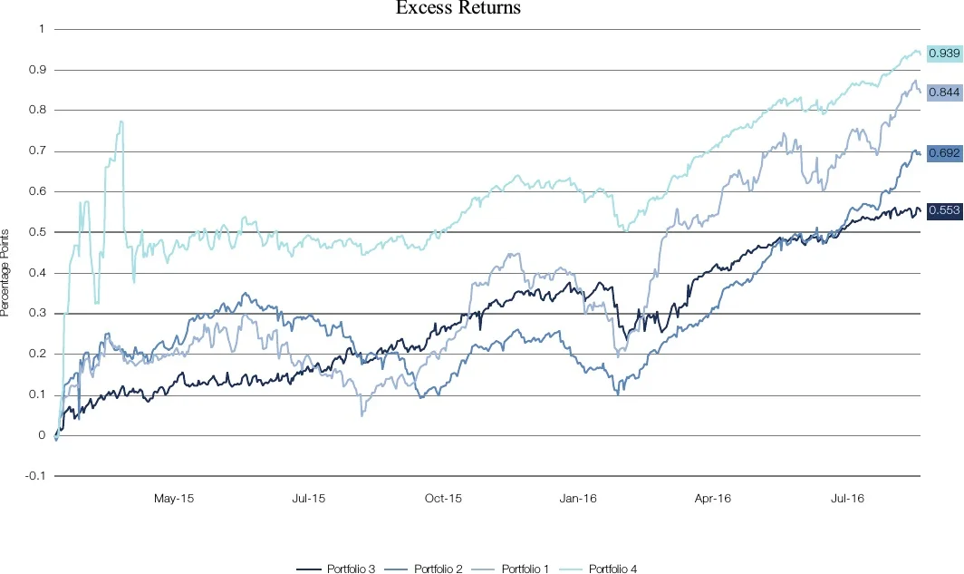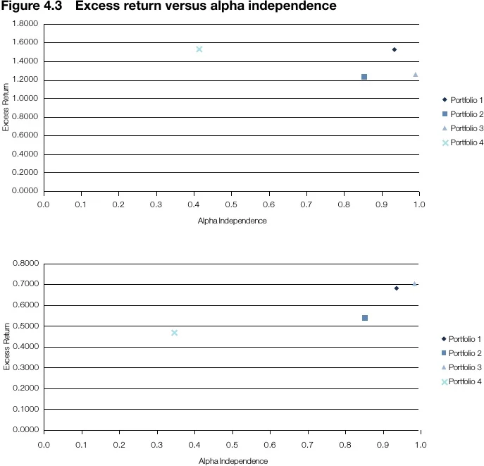 In Figure 4.2, a plot was constructed with excess returns in the y-axis and alpha independence (1–R-squared) in the x-axis, giving a better picture of what has been analysed in this case study so far.