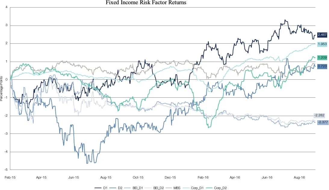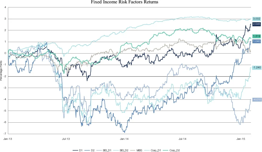 Corporate bond spread factor (CORPD1) is approximated with the excess returns versus treasuries of the Merrill Lynch 3 to 5 year A-AAA index (C210) duration adjusted.