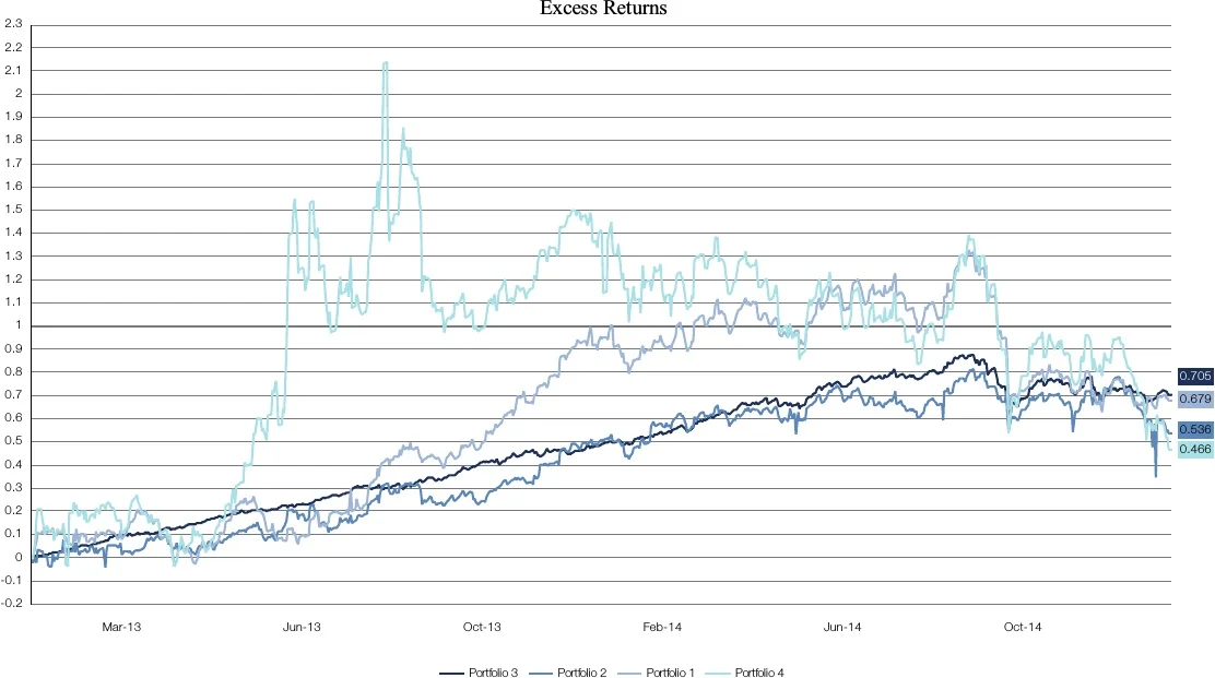 Regarding the other two portfolios, for portfolio 1 the returns of the factors explain less than 7% of the excess returns, and for portfolio 2 they explain about 15% of the excess returns. Therefore, it can be concluded that while portfolio 2 relies more on style-driven strategies, both of the managers generate most of their return using skill-driven strategies. Remember here that portfolio 1 and portfolio 2 share the same benchmarks through the whole period.