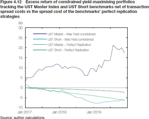 Thus, a portfolio manager striving to replicate, say, the US Treasury benchmark on a bond-by-bond basis would have faced the choice of either changing their positions or effectively taking on a small interest rate exposure vis-à-vis the benchmark. In the first case, their position may bleed due to risk misalignment, and in the other due to transaction costs that will typically not be borne by the benchmark. Indeed, in most cases, bond index benchmarks adjust positions at the market “mid” prices, whereas traders buy at the “offer” and sell at the “bid” side of the quotes (we will henceforth refer to this difference as the “spread cost”.)