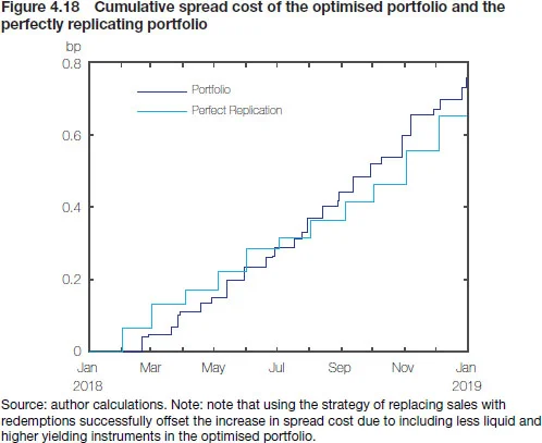 Ultimately, the proof of the pudding is in the eating, so Figures 4.17 and 4.18 focus on the backtested performance of that strategy. Over the course of the backtesting period, yields were moving higher so occasional short-duration positions relative to the benchmark generated an additional positive return for the securities portfolio. Using futures to close the duration gap neutralised this effect, which can be seen especially well in the initial months when the composition of the portfolio had not yet deviated from that of the benchmark. In the following months through the course of subsequent optimisations, the portfolio started to generate an excess return due to selection effects, which was unaffected by the futures position. The strategy of rebalancing as a side effect of redemptions successfully limited the spread cost associated with yield maximisation so that, at the end of the year, the overall excess return of our strategy remained positive even net of transaction spread cost.
