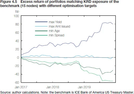 Again, which approach works best is an empirical matter, but the bottom line is that although the matching of risk exposures will in general not be perfect and is likely to leave portfolio managers with some residual uncertainty, it might save transaction costs and perhaps even generate a small return pickup if one is smart or lucky (or both!) with the choice of portfolio constituents. Consider the example in Figure 4.5, which shows for the US Treasury Master Index the monthly tracking errors of four replicating portfolios with different optimisation targets constructed according to the method outlined in Annex 4.1. Over our historical backtesting period, targeting yield would have produced truly spectacular results, with a consistently positive excess return of 2bp/month on average, leading to a cumulative return of about 80bp above the benchmark index. And while the original index comprises 260 bonds, the number of bonds in each of the replicating portfolios was only 16. However, given that higher return comes from selecting bonds with higher yields (the spread between the portfolio and the benchmark averaged 2.5bp), the portfolio also tends to be made up of less-liquid securities that might prove challenging to acquire in practice (see Figure 4.6 above).