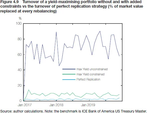 The lower liquidity of yield-maximising replicating portfolios is not the only problem, however. First, the leanness of the replicating portfolios also makes them very concentrated – with “optimal” position in some issues ranging as high as 25% – so that reserve managers with more sizeable reserves would struggle to operationalise such strategies. Second, there is a problem of portfolio turnover, as shown in Figure 4.7 for the entire backtesting exercise on a month-by-month basis. It seems that consistently maintaining the yield pickup while ensuring matched key rate duration (KRD) positions requires turning over upwards of 60% of portfolio market value at each rebalancing – on average 34 times as much as in the straightforward case of bond-for-bond replication. The estimated costs of such transactions would easily outgrow any excess return built up by carefully selecting the higher yielding bonds.