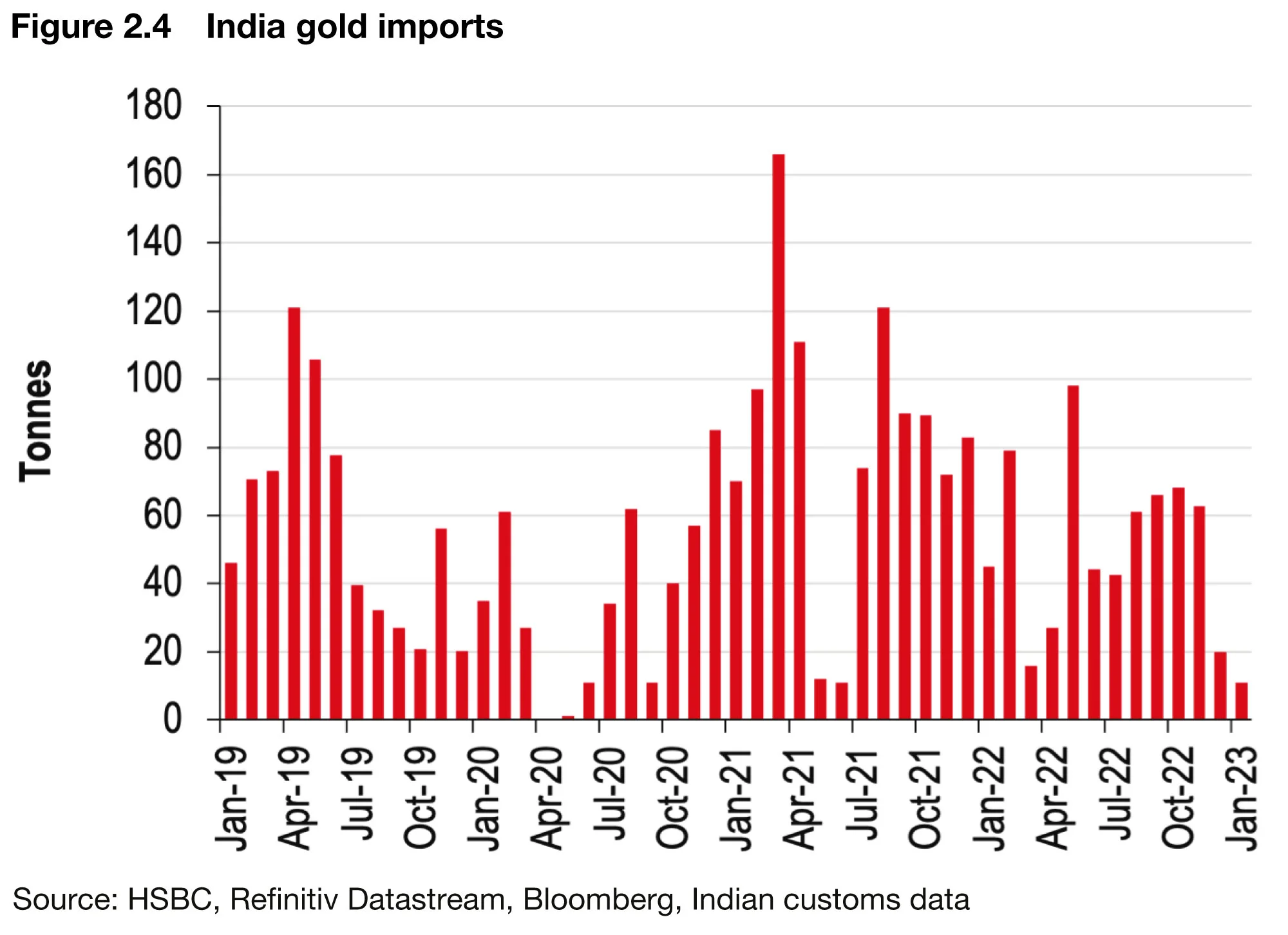 As with mainland China, Indian demand faces some economic risks. The economics team caution slowing 2H demand, which may spill over into 2023. The Indian government introduced a higher import duty on gold imports earlier in 2022, which has notably impacted bullion imports. India is usually the first- or second-largest importer of gold bullion in the world and the second-largest consumer after mainland China. India’s growth should be strong enough to support a minimum of demand although HSBC’s economics team points out that some key drivers of growth are now softening. Inflation has peaked and should moderate meaningfully in 2023 in the team’s view, from 6.6% in 2023 to 5.2% in 2024. This may moderate gold demand. The two charts below show mainland China and India imports.
