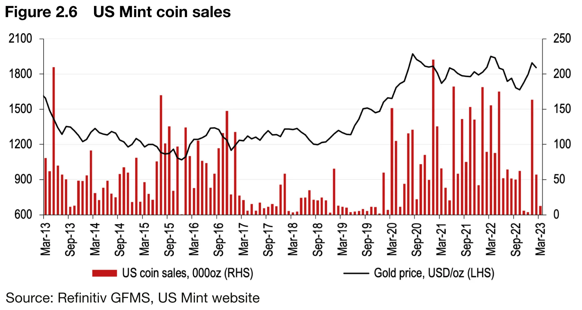 Coin data are more readily available than bars. The US Mint is the largest producer of gold coins in the world and is usually a good barometer for global demand. Using the latest data for the year to date (January–March 2023), the US Mint sold 233,000oz of gold coins, compared with 426,500oz for the same time last year. A decline in recent months may not represent a real drop in demand, but possible near-term supply chain constraints, as the premium on secondhand coins is still high, and blanks, from which coins are struck, are in short supply. Based on robust coin demand for 2022, as well as high inflation, geopolitical risks, and economic uncertainties, coin & bar demand may remain historically strong in 2023 but could dim from 2022 levels. There is often a contrast between OECD and EM markets with regard to bar & coin demand. OECD markets are often more motivated by inflation concerns, while EM purchases are often strongly linked to jewellery demand. The high premiums charged for coins are moderating demand, and may be a sign of some retail market retreat, but we still expect demand to be high this year and support prices.