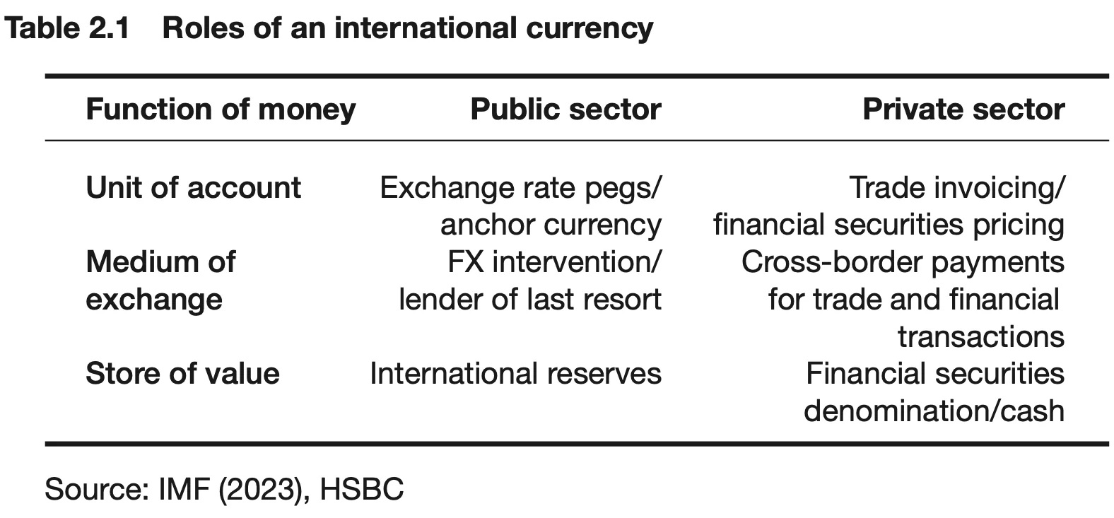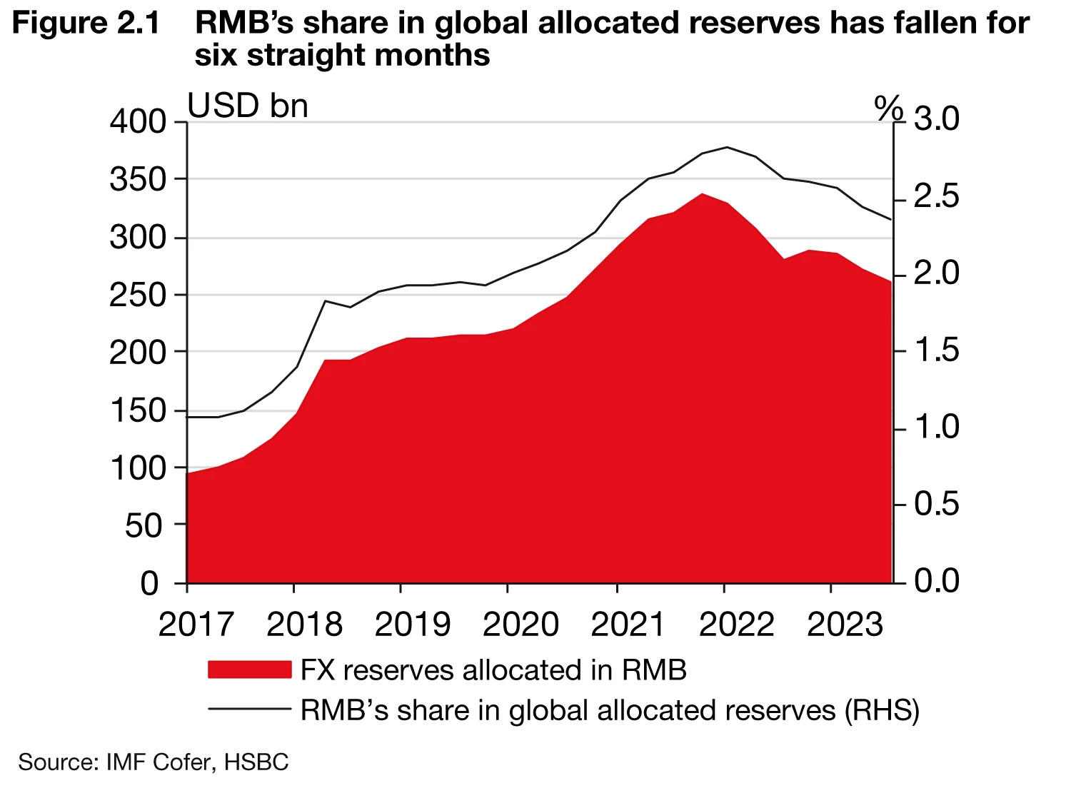 Indeed, the RMB’s global role as a reserve currency (for the public sector) and investment currency (for the private sector) has not made progress since 2022.