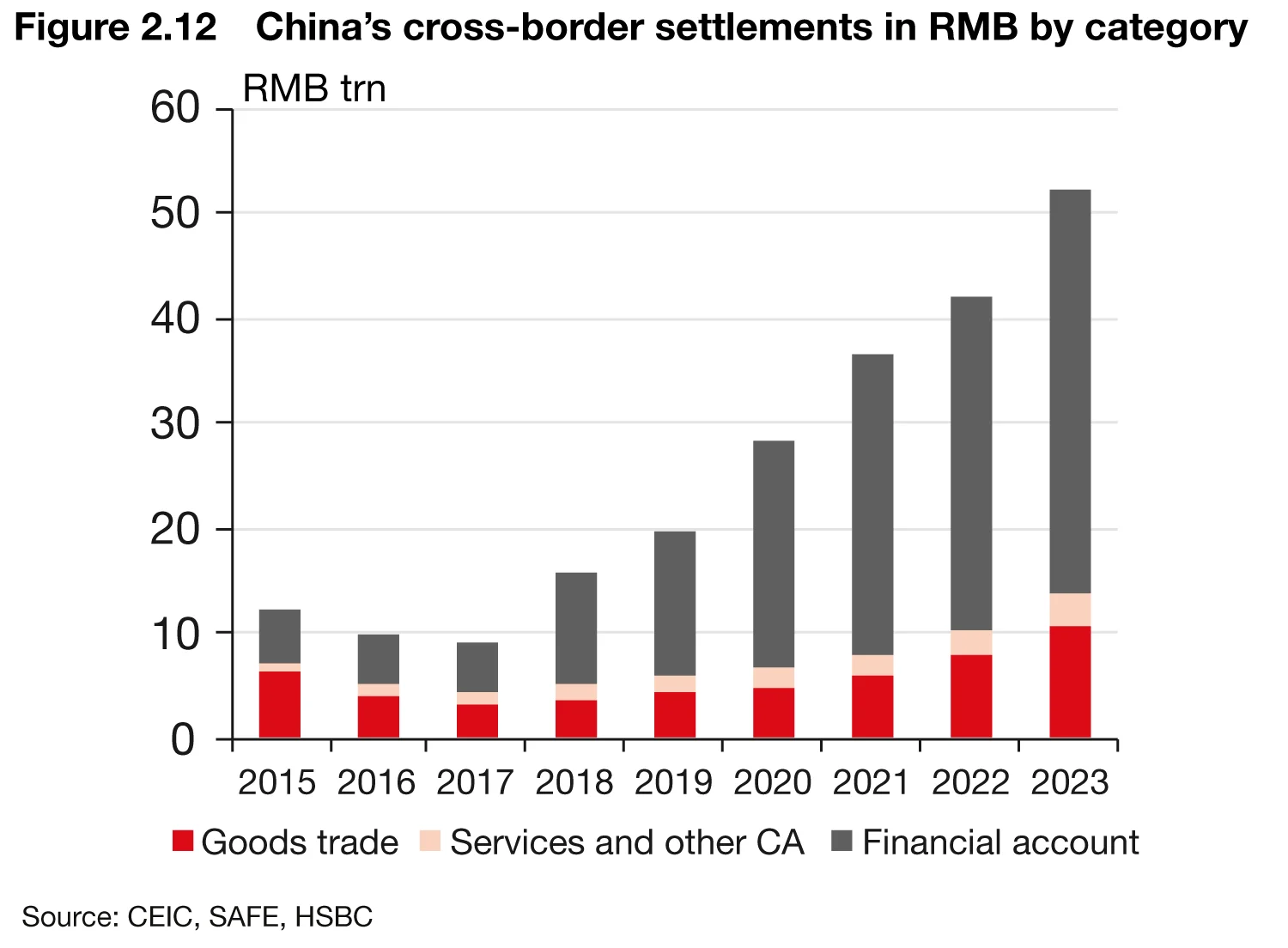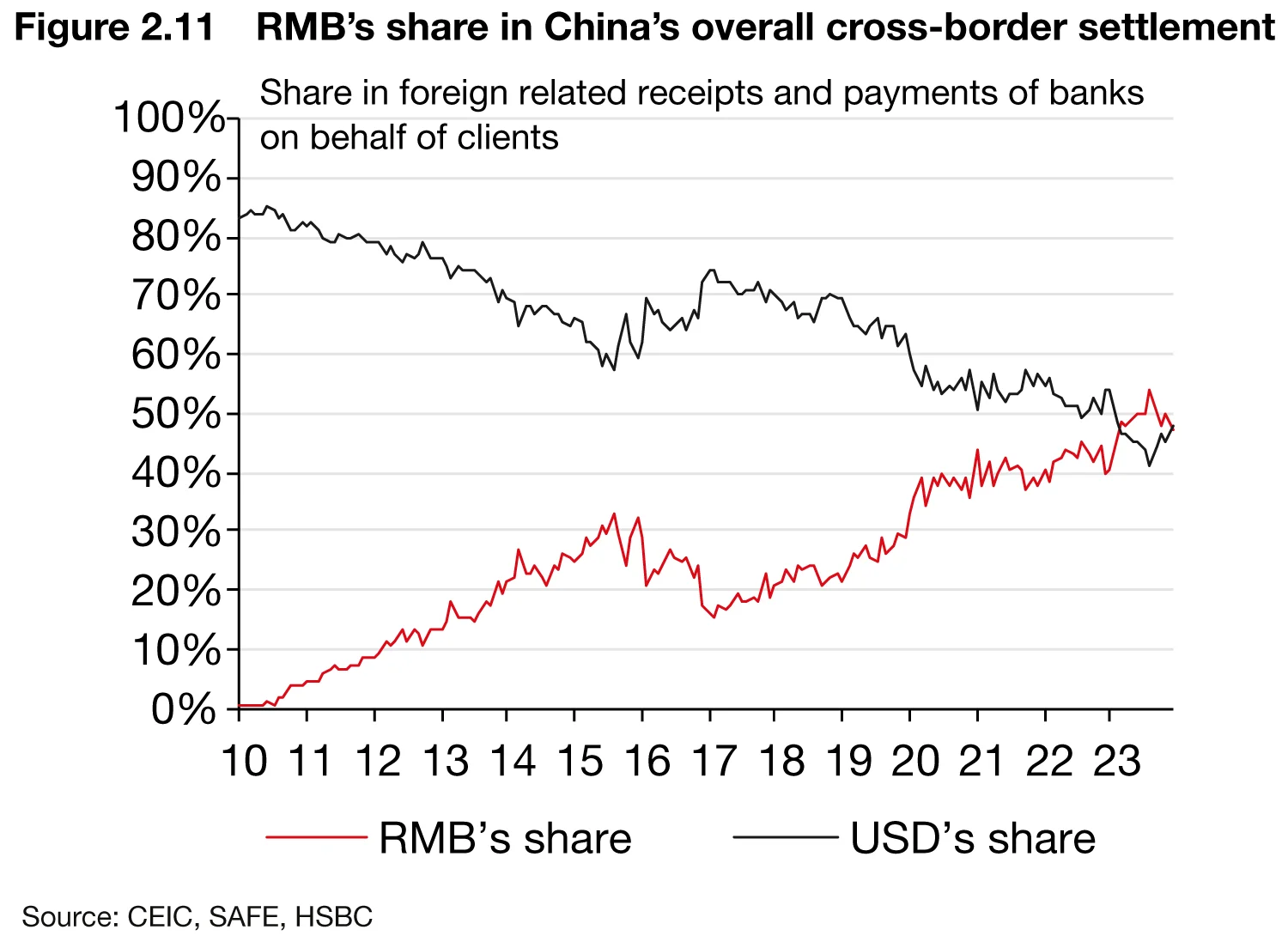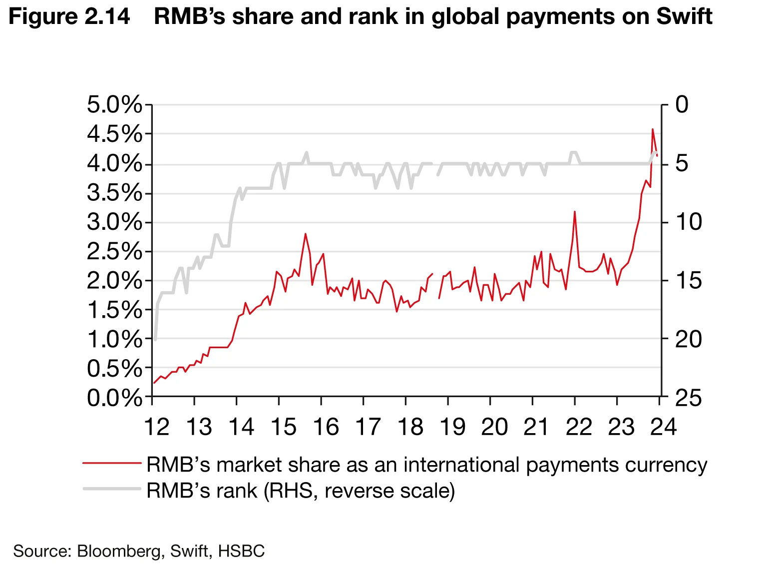 First, alongside trade settlement, the RMB has naturally gained a little market share in global trade finance – 5% in late 2023, from less than 2% two years ago.
