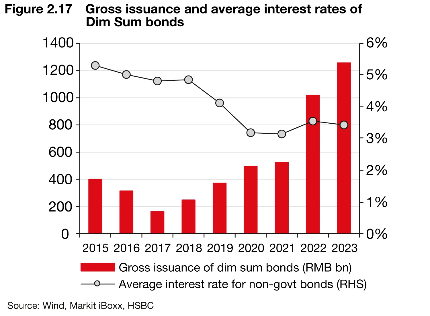 Second, the issuance of both Dim Sum bonds and Panda bonds has picked up pace in the recent years. Gross issuance of Dim Sum bonds reached 1 trillion yuan for the first time in 2022 and further rose to 1.26 trillion yuan in 2023 (figure 2.17). Gross issuance of Panda bonds nearly doubled in 2023 to 154 billion yuan (figure 2.18). The rising issuance of RMB-denominated bonds by foreign entities or in offshore markets may reflect the currency’s relatively lower borrowing costs compared with major currencies (eg, USD and EUR) after the US Federal Reserve and ECB started aggressively hiking rates. In addition, in December 2022, regulators clarified that the funding proceeds raised through Panda bonds could be repatriated overseas, providing much-needed flexibility to foreign issuers.