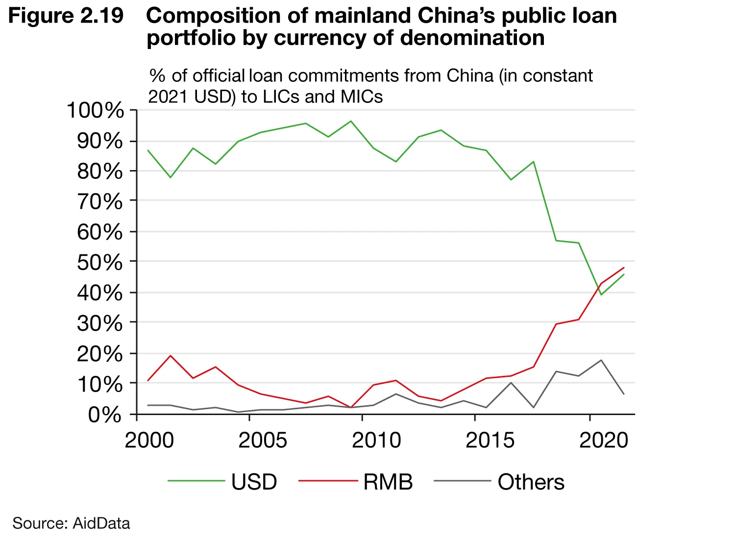 - First, China has ramped up RMB-denominated lending, and the USD’s importance in its overseas lending portfolio steadily declined. AidData estimates that the share of RMB-denominated loans in new lending commitments from China has soared from 6% in 2013 to 50% in 2021, while the USD-denominated loans’ share decreased from 93% to 44% over the same period (figure 2.19).