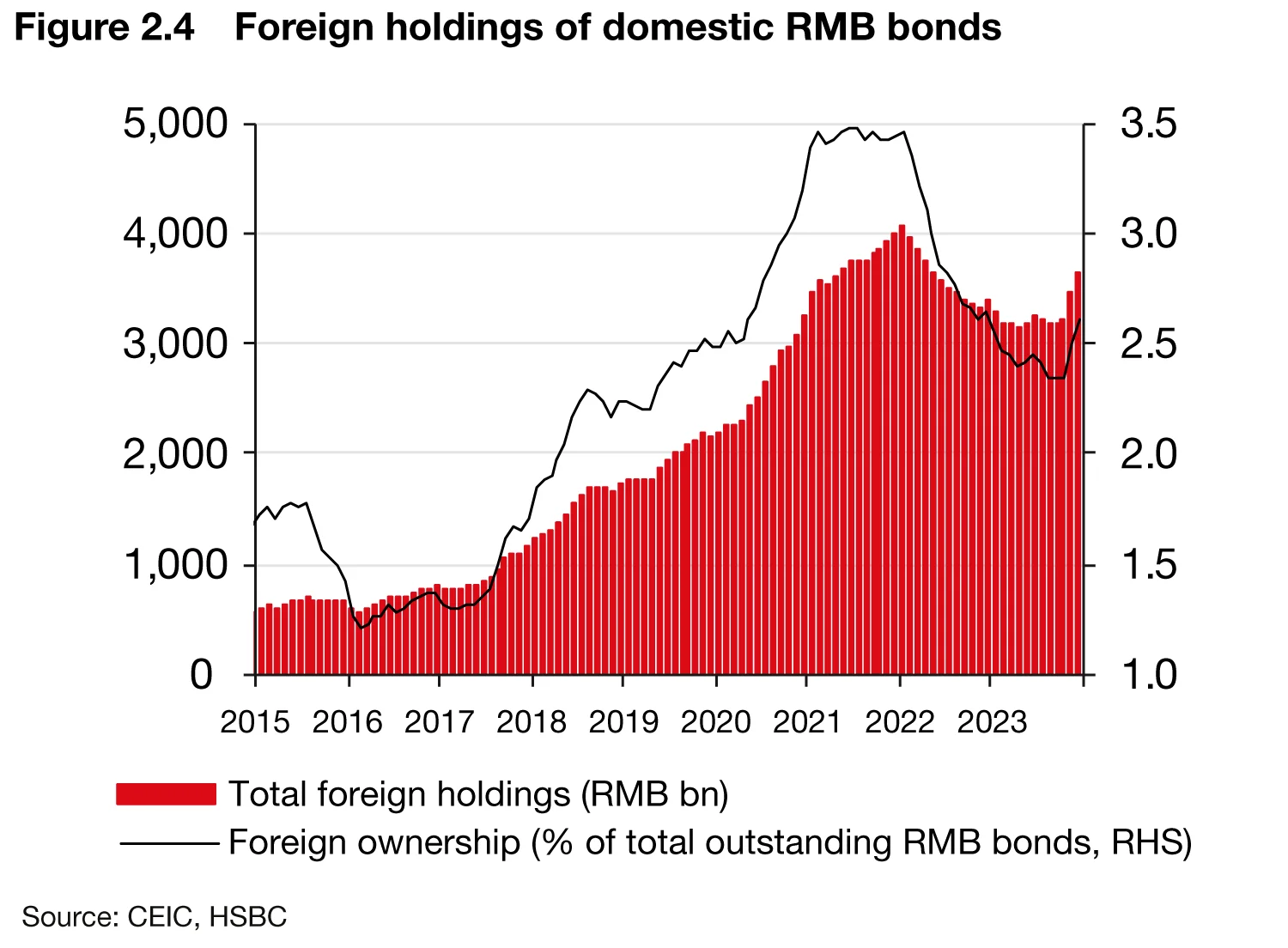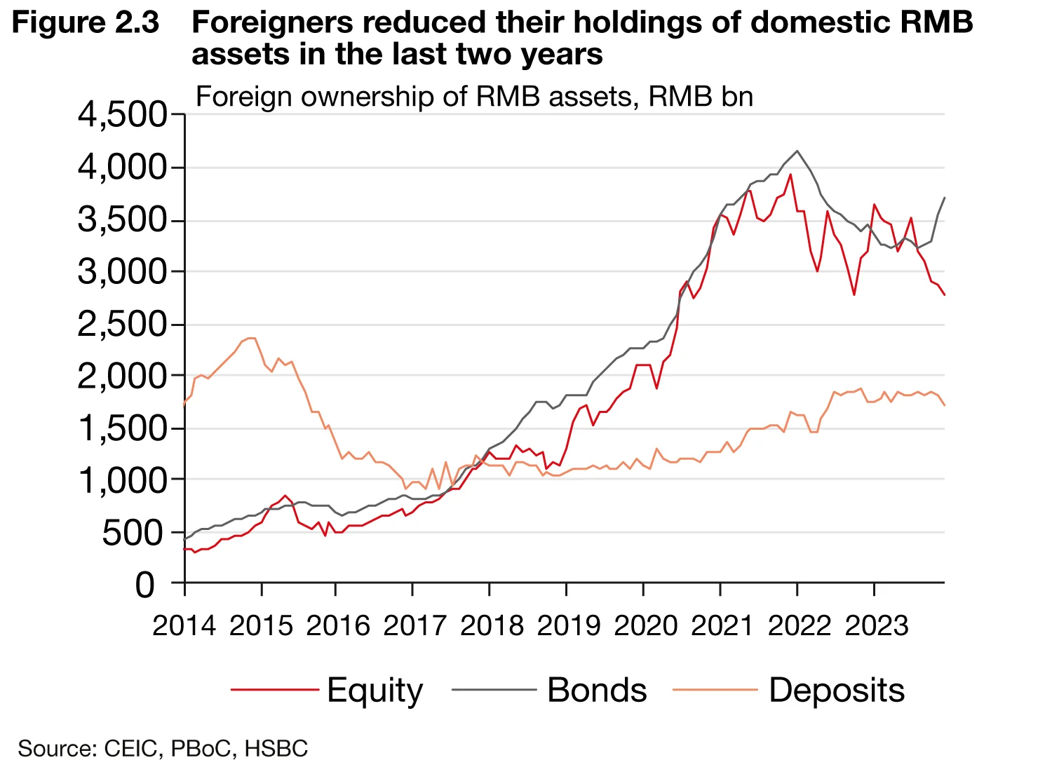 - Foreign investors have been mostly selling their RMB portfolio assets since early 2022 (figure 2.3). Bond investors sold off almost one-quarter of their onshore RMB bond holdings between February 2022 and August 2023, although they have resumed buying on a currency-hedged basis since October 2023 (figure 2.4). Equity investors sold 157 billion yuan ($21.6 billion) of their A-shares via the Northbound Stock Connect channel between April 2023 and January 2024 (figure 2.5).
