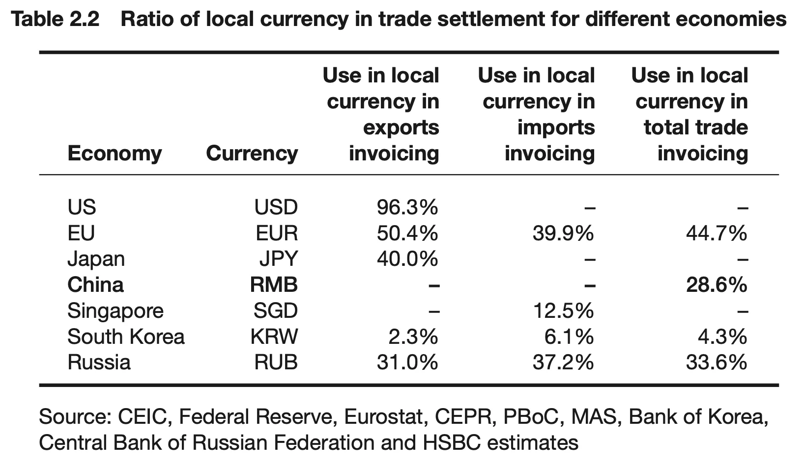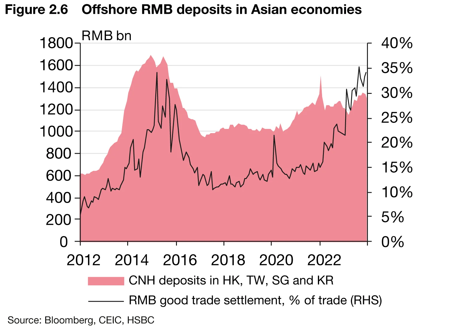 - A working paper published by the IMF (March 2023) suggests that countries that have closer trade linkages with mainland China tend to settle a larger portion of trade in RMB, based on Swift data.