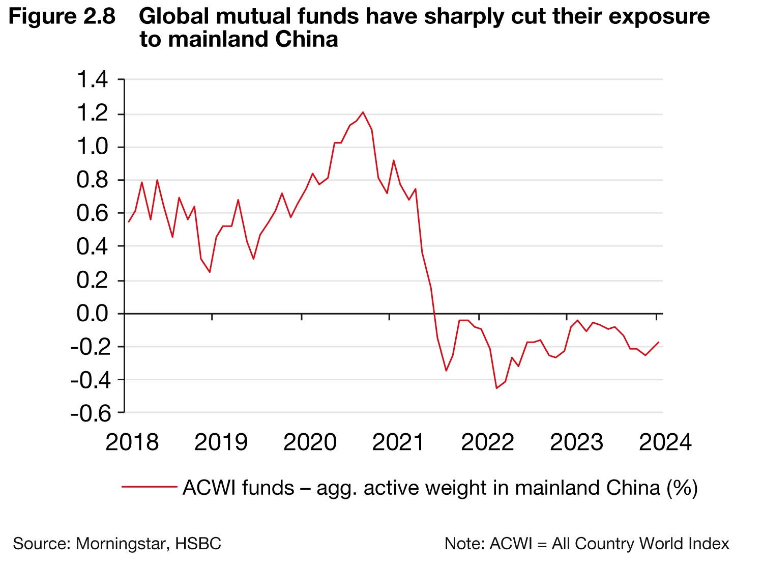 There could also be structural considerations, such as China’s ongoing debt restructuring in the property and local government sectors, and geopolitical tensions between the US and China. These issues may have affected the market’s view on China’s potential growth. HSBC equity strategists noted that global equity funds, which are dominated by US long-only funds, have been persistently reducing their exposure to China since 2020, shifting from an overweight to an absolute underweight now (figure 2.8).