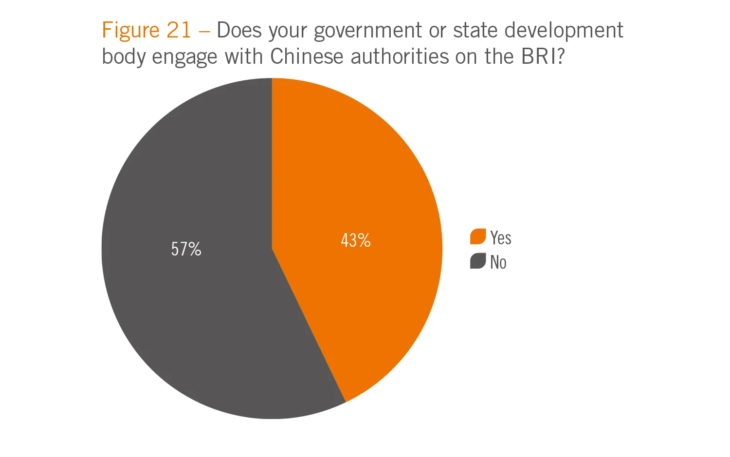 The changes could be having the desired effect. All survey respondents said they would categorise BRI-related debt as sustainable in their jurisdictions (see figure 18). However, they did exhibit some fears about debt levels in other BRI states. Fifty-seven per cent of respondents said they were concerned the BRI was causing debt to reach unsustainable levels in five or more countries, with 14% saying they were concerned about debt levels in 20 or more countries (see figure 19).