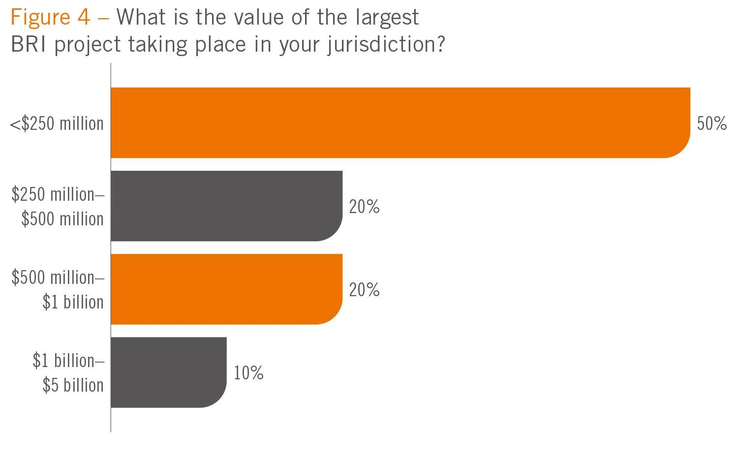There are plenty of smaller transactions too. Of those surveyed, 90% indicated the size of the largest BRI project taking place in their jurisdictions was valued at less than $1 billion – with half of respondents highlighting that combined investments into a single BRI project do not exceed $250 million in total.
