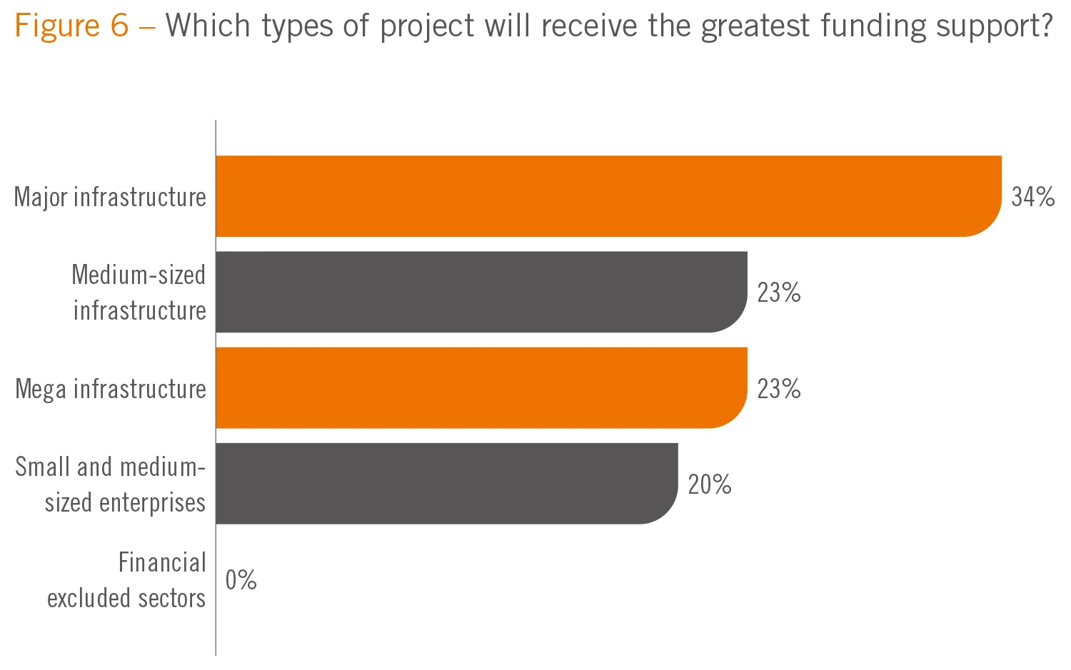 Regarding the taxonomy of projects expected to receive the greatest funding support, respondent central banks expect the BRI to simultaneously target projects of different sizes and scope across a range of jurisdictions. However, the results revealed major infrastructure projects represent the most significant focus of BRI investments, featuring in 34% of responses (see figure 6). Mega and medium-sized infrastructure projects featured in almost a one-quarter of responses each – with small and medium-sized enterprises selected in one-fifth of participating central banks’ responses. None of the respondents indicated BRI support for financially excluded sectors.