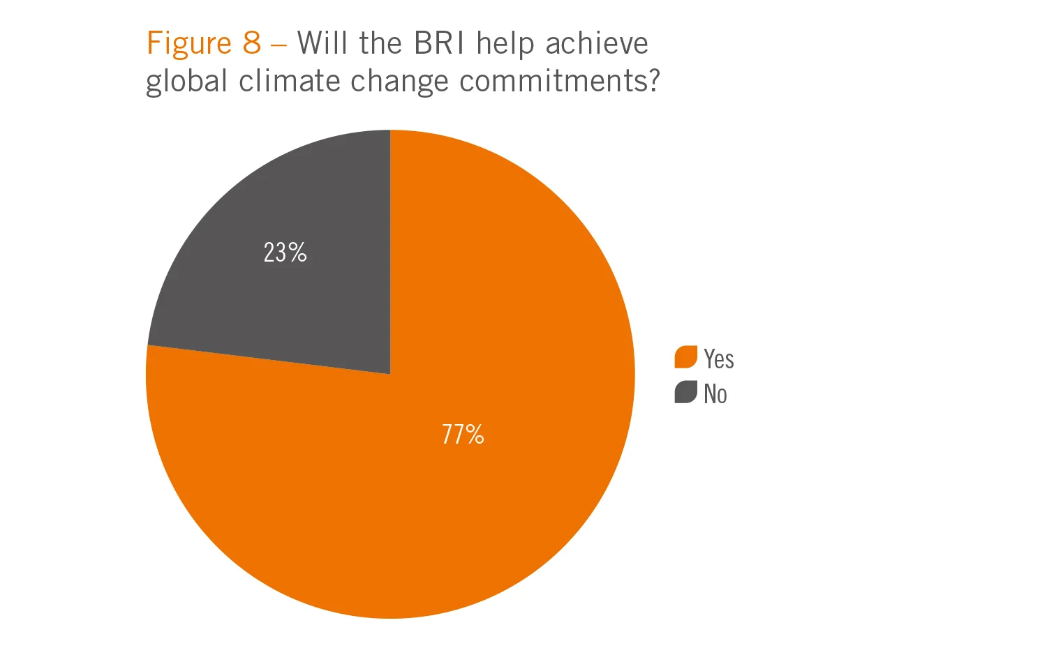 While 77% of respondents said the BRI would help achieve global climate commitments, 23% did not (see figure 8). “The project will require a huge investment in infrastructure and other economic projects, which in turn is expected to lead to more climate changes,” said a small central bank from the Middle East.
