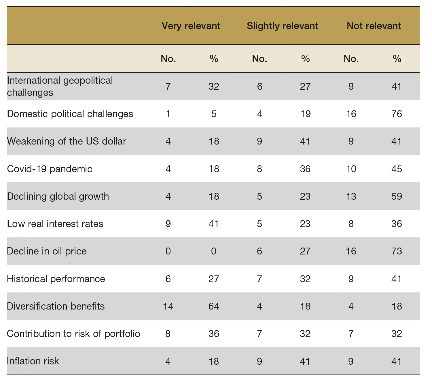 Just over half of respondents said “historical performance” was relevant, and several mentioned legacy or legal requirements in their comments. “Decline in oil prices” and “domestic political challenges” were not, however, seen as relevant for this group, and there was only marginal support for “weakening of the US dollar”, “Covid-19 pandemic”, “declining global growth” and “inflation risk”.