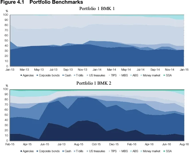 The whole observation period is from 31 December 2012 to 31 August 2016, but there is a change in the benchmark for the external managers and for the internally managed sub-portfolios starting from 31 January 2015. The benchmarks are set as shown in Table 4.1.