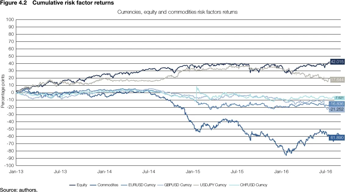 For equity, the analysis takes the return of the S&P 500 index, for commodities, the Goldman Sachs commodity index, and for currencies the analysis takes the return of the four major currencies.