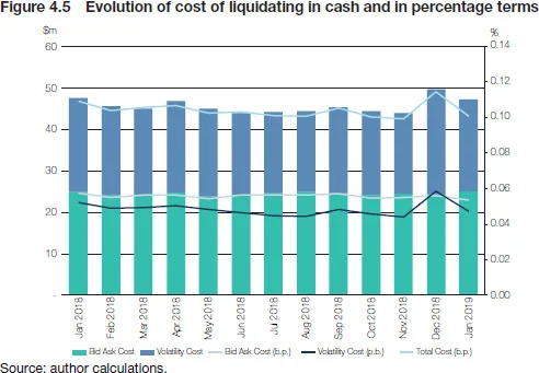 Following this, it is possible to use the cost of liquidation formula for each asset and calculate the cost of each issue. As was the case with the previous results, the information generated can also be aggregated in several ways and many important conclusions drawn. Figure 4.5 serves as an example of how the evolution of liquidation costs can be monitored and attributed to understand where the liquidity cost is materialising.