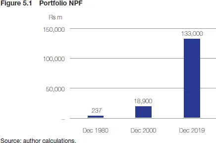 The case for Mauritius to set up an ALM framework is compelling. In the past four decades, the country has built up a considerable amount of both assets and liabilities. The balance sheets of the government and various governmental institutions (parastatal bodies and state-owned enterprises, SOEs) have continuously expanded as a result of sustained economic growth. As illustrated in Figures 5.1–5.4, the government’s investment in shares and other equity grew from MRs193m in 1980 to around MRs22 billion by end-June 2018.1010 MRs are the Mauritius currency of rupees. The country’s gross official foreign currency reserves, managed by the Bank of Mauritius, increased from MRs780m in 1980 to around MRs270 billion at the end of December 2019, and to MRs274 billion by end-February 2020. A large part of government investments is made through the SIC,1111 The SIC was established in 1984 to provide equity finance to both existing and new enterprises in all sectors of the economy, varying from small- and medium-sized enterprises to high-growth entrepreneurial ventures. which by the end of 2018 had accumulated an investment portfolio of some MRs7 billion compared to that of MRs700m in 1988. At December 2019, the NPF1212 The assets of the NPF are under the control of the government. The NPF is a contributory private sector pension plan, with defined contribution from employers and employees. The investments of the NPF are overseen by a tripartite investment committee comprising representatives of government, employers and employees. It is expected that the NPF will generate surplus funds until 2028. had an investment portfolio of MRs133 billion compared with MRs237m in 1980.